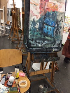 In de tweede les gingen we aan de slag met onze verhalen. We moesten een collage maken van de setting van het verhaal. Deze collage was een groepsproject. We hebben op de gang naast het lokaal op de muur de tekeningen opgehangen.
